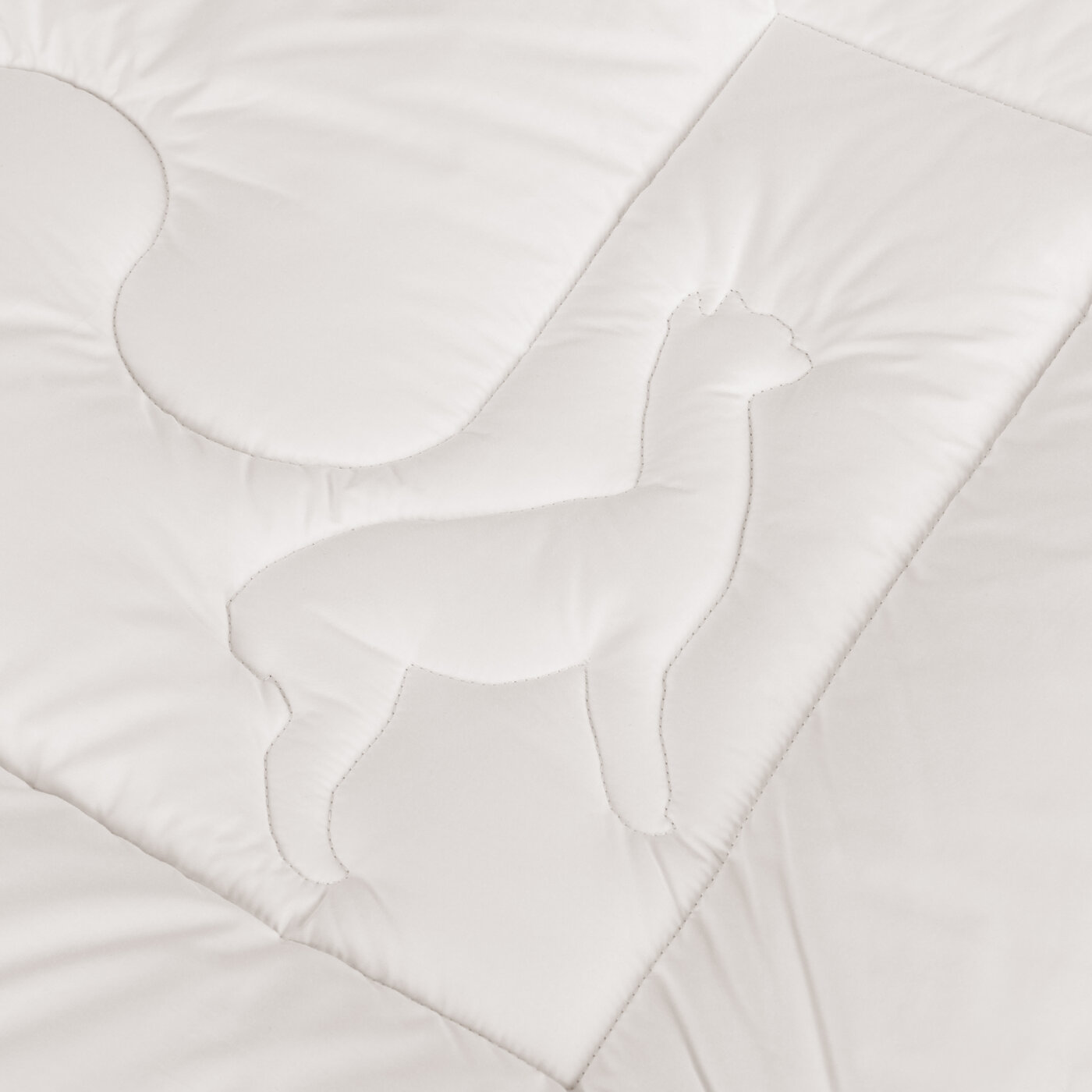 Kołdra naturalna, antyalergiczna, wypełniona w 100% wełną z Alpaki o unikalnych właściwościach termoregulacyjnych i hipoalergicznych. Wełna pochodzi od alpak hodowanych w Andach w Ameryce Południowej. Surowe warunki klimatyczne sprawiły, że ich runo posiada wyjątkową zdolność dostosowywania się do warunków temperatury otoczenia – skutecznie ogrzewa zimą równocześnie zapewnia przyjemny odpoczynek latem. Kołdra została obszyta ekskluzywną tkaniną 100% bawełnianą i wykończona elegancką białą lamówką. Kołdra jest miękka, przewiewna a jednocześnie delikatna i miła w dotyku. Specjalne przepikowanie w wzór przypominający puzzle, zapobiega przemieszcza się wypełnienia, dzięki czemu kołdra na długo zachowuje swoją puszystość i idealny kształt. Posiada doskonałe właściwości oddychające oraz zdolność absorbowania wilgoci, ale nie zatrzymuje jej, pozostawiając uczuci naturalne otulenia. Kołdra posiada szerokie gładkie obrzeże, które stwarza dodatkową delikatność i miękkość podczas użytkowania. Kołdra przeznaczona do użytku przez cały rok.